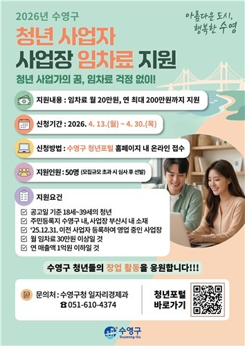 부산광역시 수영구(구청장 권한대행 정영란)는 경기침체로 어려움을 겪는 청년 자영업자의 경제적 부담을 완화하기 위해 2026년 '청년 사업자 임차료 지원 사업'을 추진한다고 밝혔다.
