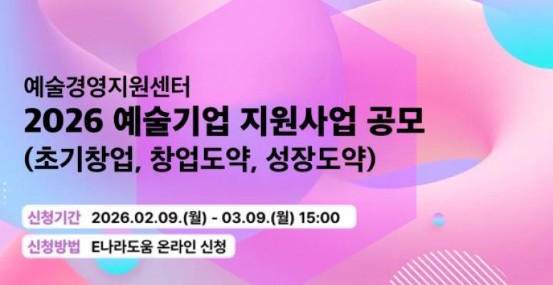 세종--(뉴스와이어)--문화체육관광부와 예술경영지원센터는 예술분야 창업기업의 사업 고도화 및 확장에 필요한 맞춤 창업보육이 필요한 팀들을 대상으로 진행하는 ‘2026 예술분야 창업도약 지원사업’의 참가 기업을 3월 9일까지 모집한다.페인터즈앤벤처스가 ...