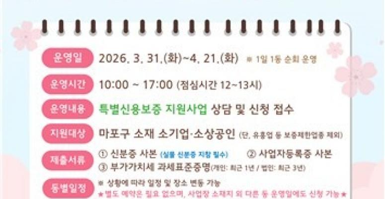 마포구(구청장 박강수)가 소기업과 소상공인의 금융 이용 문턱을 낮추기 위해 구청이 아닌 '현장'으로 찾아간다.특별신용보증은 담보력이 부족한 소기업과 소상공인(단, 유흥주점업·사행시설 등 보증제한 업종은 대상에서 제외)이 무담보로 대출을 받을 수 있도록...