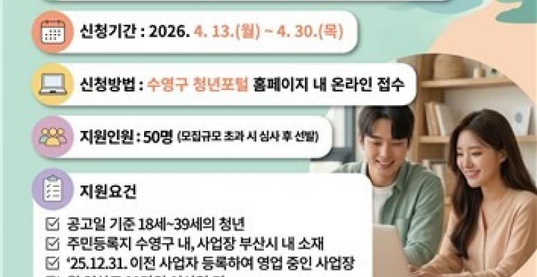 부산광역시 수영구(구청장 권한대행 정영란)는 경기침체로 어려움을 겪는 청년 자영업자의 경제적 부담을 완화하기 위해 2026년 '청년 사업자 임차료 지원 사업'을 추진한다고 밝혔다.해당 사업은 부산시 내 사업장을 운영하는 수영구 청년을 대상으로 임차료 ...