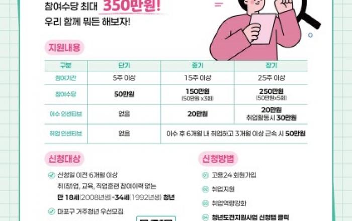 마포구가 구직단념청년의 사회 재진입을 돕는 '청년도전지원사업' 규모를 130명으로 확대하며 지원을 강화한다.'청년도전지원사업'은 구직에 어려움을 겪는 청년에게 자신감 회복과 진로 탐색, 취업역량 강화를 지원하는 프로그램으로, 마포구 고용복지지원센터(매봉산로 18)에서