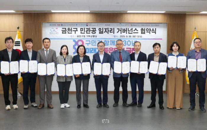 금천구(구청장 유성훈)는 지역 내 일자리 창출 활성화를 위해 금천구 민관공 일자리 거버넌스를 구성하고, 30일 참여기관들이 모여 업무협약식을 개최했다고 밝혔다.