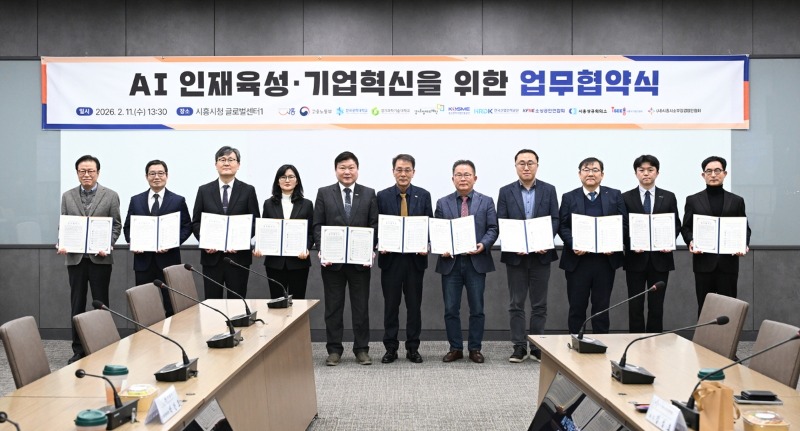 시는 지난 2월 11일 시청 글로벌센터에서 11개 관계기관이 참여하는 '인공지능 인재 육성·기업혁신을 위한 업무협약'을 체결했다. 이날 협약식에는 시흥시 부시장을 비롯해 각 협약기관 대표들이 참석했다.