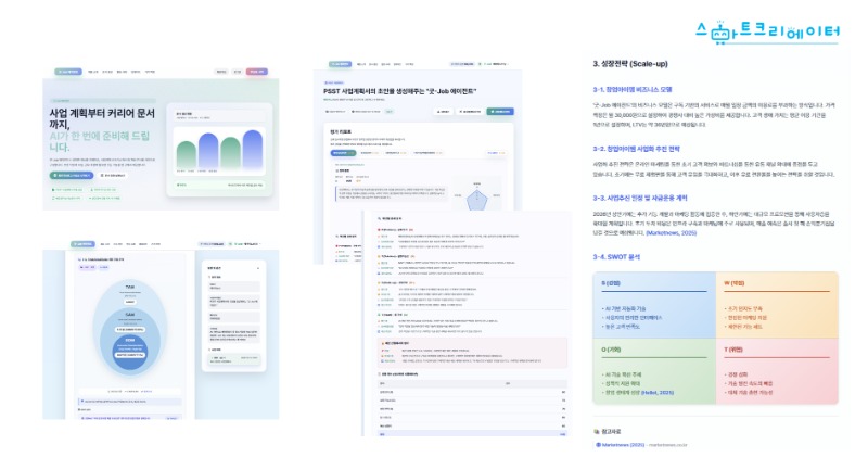 두 번째는 ‘PSST(Problem-Solution-Scale up-Team) 기반 AI 창업사업계획서 작성 모듈’이다. 예비 창업가들을 위해 국내 최초로 선보이는 획기적인 기능으로, 사용자가 사업 아이템과 핵심 내용을 입력하면 AI가 창업사업계획서 PSST 프레임워크에 맞춰 체계적인 질문을 제시하고, 답변을 토대로 논리적인 사업계획서 초안을 자동 완성한다. 해당 기능은 초기 창업가들이 겪는 막막함을 해소하는 데 큰 도움이 될 것으로 기대된다.