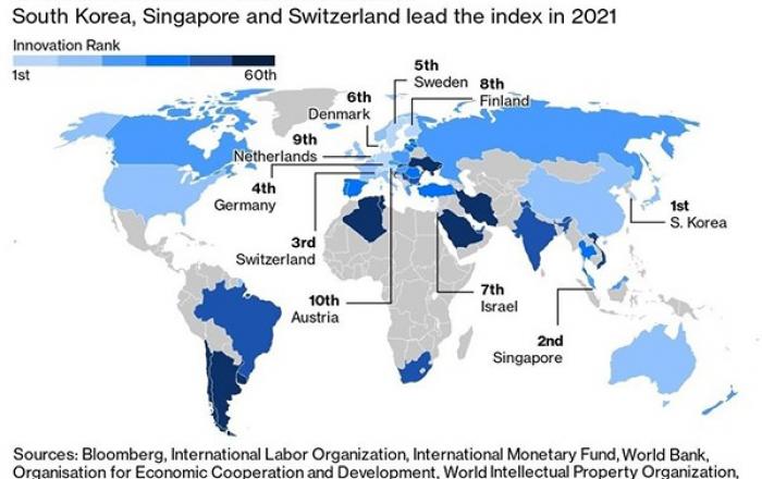 한국이 ‘2021년 블룸버그 혁신지수’ 세계 1위를 차지했다. 3일 기획재정부에 따르면 블룸버그가 이날 발표한 2021년 블룸버그 혁신지수에서 우리나라는 90.49점으로 60개국 중 1위를 차지하며 전년보다 한