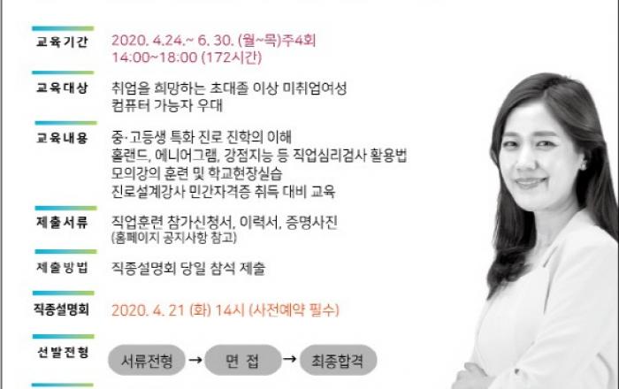 송파여성새로일하기센터(이하 송파센터, 관장 유근수)가 2020 여성가족부 직업훈련 사업의 일환으로 마련한 ‘진로설계강사 양성과정’ 훈련생을 모집한다고 밝혔다.진로설계강사는 중고등학생 진로 지도 강사, 자유학기제 진로 체험 강사(학교), 진로 직업 체험센터, 진로 직업