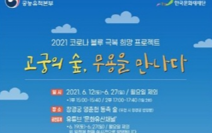 문화재청 궁능유적본부와 한국문화재재단은 코로나19 장기화로 지친 시민들에게 우리 전통문화 공연으로 문화생활의 기회를 제공하고자 오는 12∼27일까지 고궁 음악회 특별공연 '고궁의 숲, 무용을 만나다'를 창경궁 영춘헌 동측 숲에서 개최한다.이번 행사는 5월 창덕궁 '국악