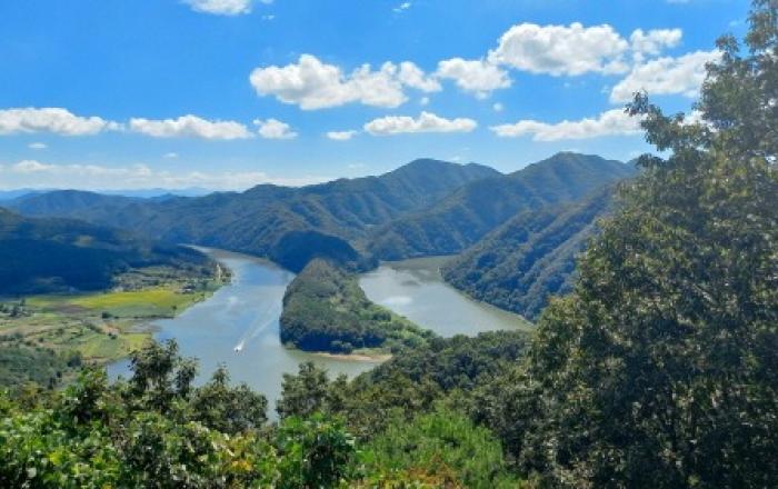 청명한 가을 하늘과 굽이치는 금강이 어울리는 명소! 충북 옥천의 가장 작은 행정구역 안남면에 우뚝 솟아있는 둔주봉(384m) 7부 능선쯤 전망대에 오르면 휘감아 도는 금강 줄기가 만들어 낸 한반도 지형에 감탄이 절로 나온다.그뿐인가! 등반하는 동안 온몸을 적신 땀은 시