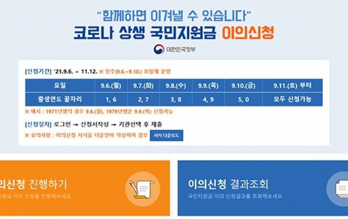 국민권익위원회가 오는 11월 12일까지 국민신문고 누리집(http://www.epeople.go.kr)에 코로나 상생 국민지원금 이의신청 창구를 운영한다.이의신청 사유는 올해 7월 1일부터 11월 12일까지의 기간 내에 출생 또는 해외 체류자 귀국 등으로 가족관계가 변