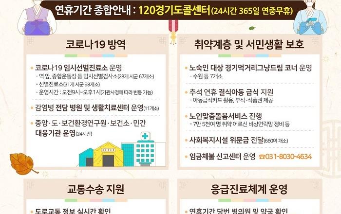 경기도가 도민의 안전하고 편안한 명절을 위해 ‘추석 연휴 종합대책’을 추진한다.이번 종합 대책은 추석 연휴기간(9.18.~22.) 동안 ▲감염병 대응 ▲민원처리 ▲교통수송 ▲서민안정 ▲취약계층 지원 ▲응급진료 ▲안전사고 대응 ▲지도단속 ▲환경오염 예방 ▲공직기강 등 총