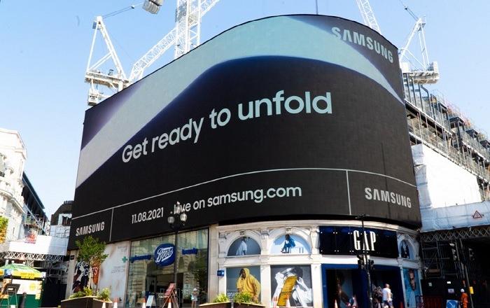 삼성전자가 ‘삼성 갤럭시 언팩 2021(Samsung Galaxy Unpacked 2021: Get ready to unfold)’을 앞두고 전 세계 주요 랜드마크에서 옥외광고를 진행한다.▲ 삼성 갤럭시 언팩 2021 옥외광고(홍콩 센트럴 엔터테인먼트 빌딩)삼성전자는