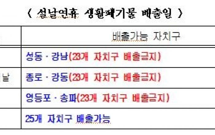 서울시는 시민들이 쾌적한 환경에서 설 명절을 보낼 수 있도록 청소 종합대책을 마련하여 시행한다고 밝혔다. 연휴 기간 시민 불편이 없도록 설날 전·중·후로 나눠 자치구별 생활폐기물 수거 및 배출일을 지정, 운영할 계획이다. 연휴 전(2.8.~2.10.) :