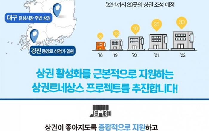 중소벤처기업부는 구도심의 낙후된 상권을 활성화하기 위한 프로젝트인 ‘상권 르네상스’ 4차 사업 대상지 8곳을 최종 선정했다고 30일 밝혔다.선정된 지자체는 서울 동작, 경기 양평, 강원 춘천, 충북 제천, 전북 부안, 전남 진도, 경북 문경, 경남 창원 등이다.이로써