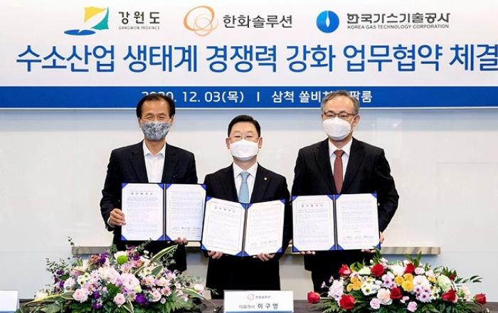 한화솔루션이 민·관·공 협력투자사업을 통해 재생 에너지 기반의 그린 수소 생산 단지를 조성한다. 풍력 발전으로 생산한 전력을 수소로 전환하는 그린 수소 기술을 확보하면서 국내 수소 생태계 구축을 위한 투자에도 나서는 것이다.한화솔루션은 3일 강원도·한국가스기술공사와 '