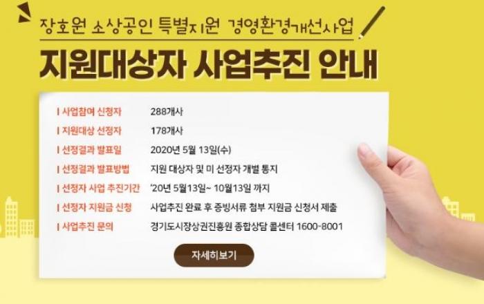 경기도와 경기도시장상권진흥원(이하 경상원)은 지난 24일 제3차 우한 교민 수용시설로 선정된 국방어학원이 위치한 장호원 지역 소상공인의 경영 안정화 지원을 위해 경영환경개선사업 특별지원 모집을 마감하고 총 288개사 신청 중 최종 178개사 선정결과를 13일 발표했다.