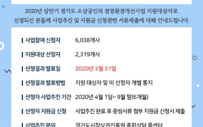 경기도와 경기도시장상권진흥원(이하 경상원)은 도내 소상공인 대상 영업 비용 절감으로 실질 소득 증대를 통한 점포 경영 안정화를 위해 시행한 경영환경개선사업을 4월 1일부터 본격 지원한다고 31일 밝혔다.경영환경개선사업은 1,900개사 모집에 6,038개사가 지원해 3.