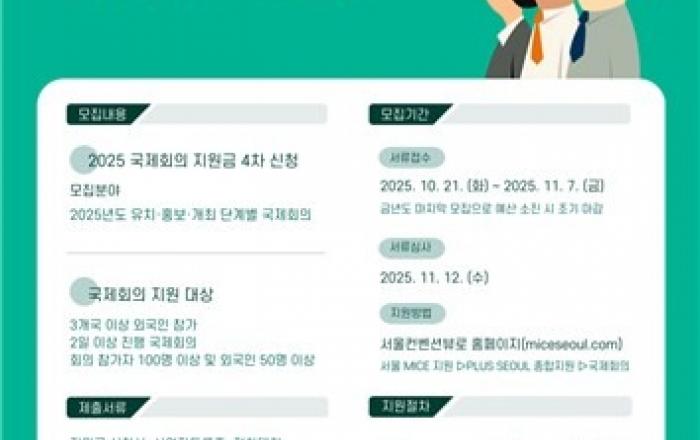서울시와 서울관광재단(대표이사 길기연)은 국제회의 유치·홍보·개최 지원을 위한 국제회의 지원금 4차 추가 모집을 11월 7일(금)까지 진행한다고 밝혔다.서울시는 서울에서 국제회의를 유치하거나 개최하는 기관·단체를 대상으로, 회의의 규모 및 단계에 따라 지원금을 지급한다