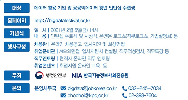 특히 이번 박람회에서는 이력서 첨삭부터 면접까지 지원하는데, ‘공공빅데이터 청년 인턴쉽 JOB 페스티벌’(http://www.bigdatafestival.or.kr)에 접속하면 관련 서비스를 제공 받을 수 있다.