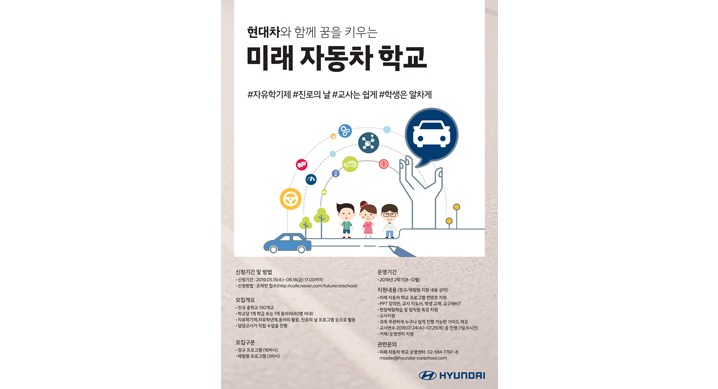 현대자동차(주)가 이달 14일(금)까지 중학교 자유학기제 특화 진로 교육 프로그램 ‘현대자동차와 함께 꿈을 키우는 미래 자동차 학교(이하 ‘미래 자동차 학교’)’ 2019년 2학기 참여 학교 150개교를 모집한다고 5일(수) 밝혔다.