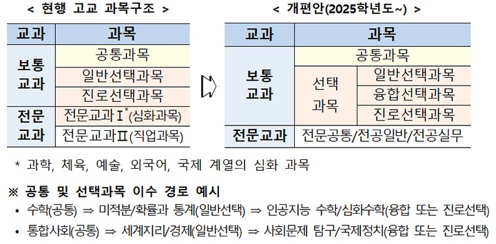 학생 선택권을 높이기 위해 고등학교 과목구조를 개편, 그간 주로 특목고에서 개설한 전문교과Ⅰ을 보통교과로 편제하고 선택과목을 일반·융합·진로과목으로 편성할 예정이다.