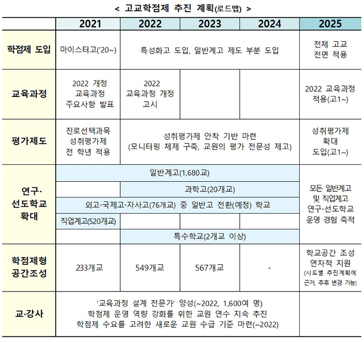 2022년부터 특성화고에 학점제를 도입하고 일반계고에 제도를 단계적으로 적용하는 과정을 거쳐 2025년에 전체 고등학교에 전면 적용될 예정이다.