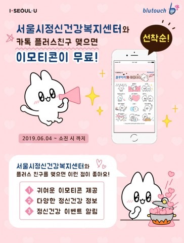 카카오톡 플러스친구 이모티콘 이벤트 관련 사항은 블루터치 홈페이지에서 확인할 수 있으며 자세한 내용은 서울시정신건강복지센터 정신건강증진팀으로 문의하면 된다.