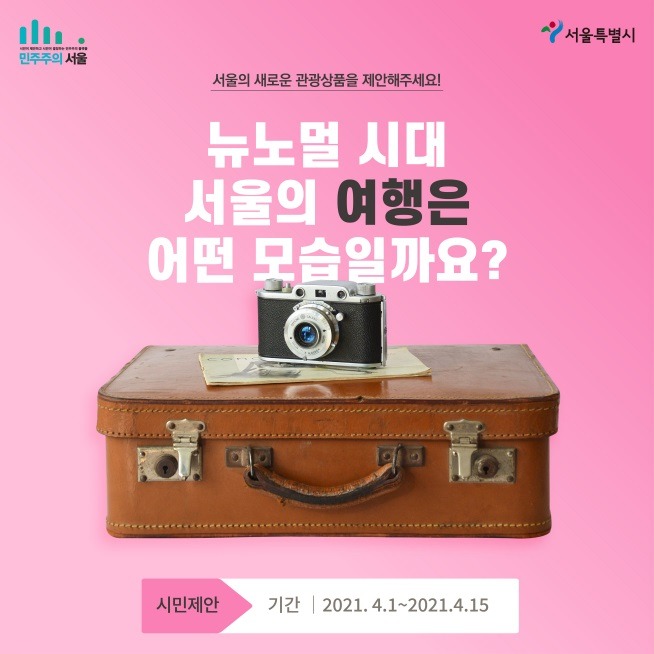 이에 서울시와 서울관광재단은 코로나19 이후, 새로운 기준(New Normal)에 맞는 관광 트렌드를 선도할 창의적 아이디어 발굴을 위해 오는 4월 1일(목)부터 15일(목)까지 ‘민주주의 서울’(democracy.seoul.go.kr)에서 서울시민들의 톡톡 튀는 의견을 제안 받는다고 밝혔다.