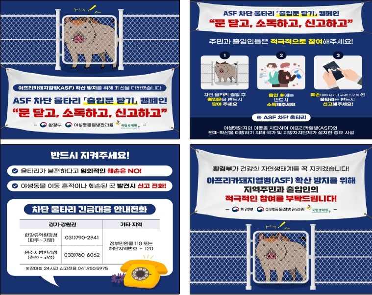 이 밖에도 환경부는 ‘아프리카돼지열병 차단 울타리 출입문 닫기’ 운동(문닫고, 소독하고, 신고하고)을 실시하며, 이번 여름철 기간 동안 집중적인 홍보를 통해 지역주민들과 함께 하는 차단방역 체계를 구축할 예정이다.