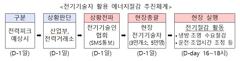 산업부는 한국전기기술인협회(회장 김선복, 이하 ‘협회’)와 협력하여 전기기술자(안전관리자)와 실시간 연락체계(sms통보 등)를 구축하고, 현장사정을 가장 잘 파악하고 있는 전기기술자들을 활용하여, 전력예비율이 낮아지는 시기에는 전기피크 시간대(16~18시)에 냉방‧조명 수요절감, 운전시간 조정 등 자발적인 에너지절감을 유도할 계획이다.