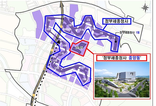 기존청사는 연면적 63만㎡에 35개기관이 입주해 현재 1만 2000명이 근무 중으로, 15개의 건물이 환상형으로 연결돼 ‘정부세종청사 1동~15동’으로 불리고 있고 정부세종2청사 16~17동은 이곳과 2.5㎞ 떨어져 있다.