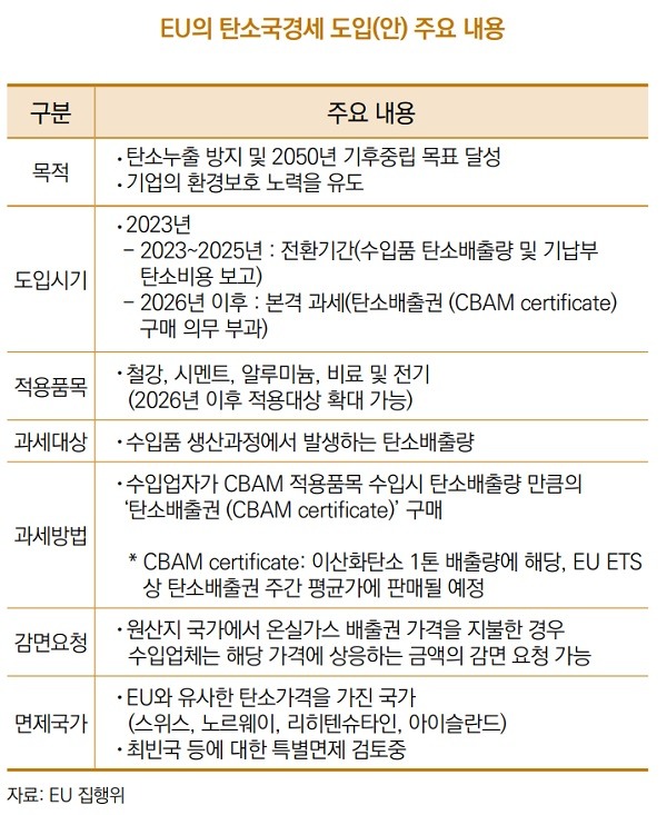 산업통상자원부에 따르면 EU는 2023년 1월 1일부터 철강·시멘트·비료·알루미늄·전기 등 5개 분야에 탄소국경세를 적용할 계획이다. 탄소국경세는 EU로 수입되는 제품의 탄소 함유량을 조사해 EU의 탄소배출권거래제(ETS)와 연계된 탄소 가격을 별도로 부과한다. 2023년부터 3년동안은 수입품의 탄소배출량 보고만 받고, 2026년부터는 실제로 부과하는 방식이다.