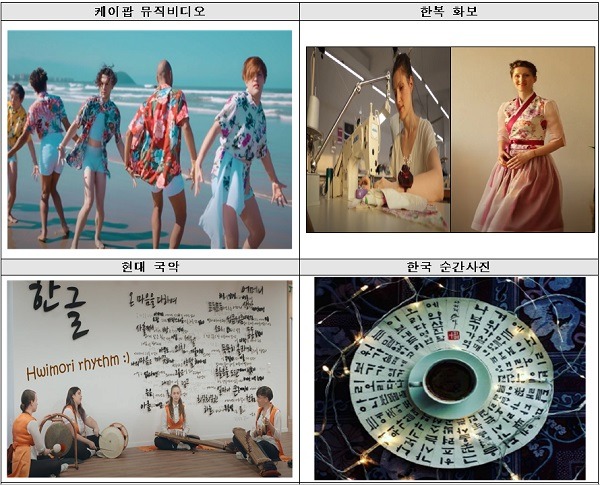 ‘케이팝 뮤직비디오’ 부문에서는 이미 조회 수 79만 회를 넘은 브라질 댄스팀의 영상 작품이, ‘한복 영상’ 부문에서는 한복을 구하기 쉽지 않은 상황에서 참가자가 직접 한복을 제작해 입고 찍은 영상 작품이, ‘한국 순간사진’ 부문에서는 김소월의 시 ‘진달래꽃’을 멋글씨(캘리그래피)로 연출한 작품 등이 눈길을 끌었다.