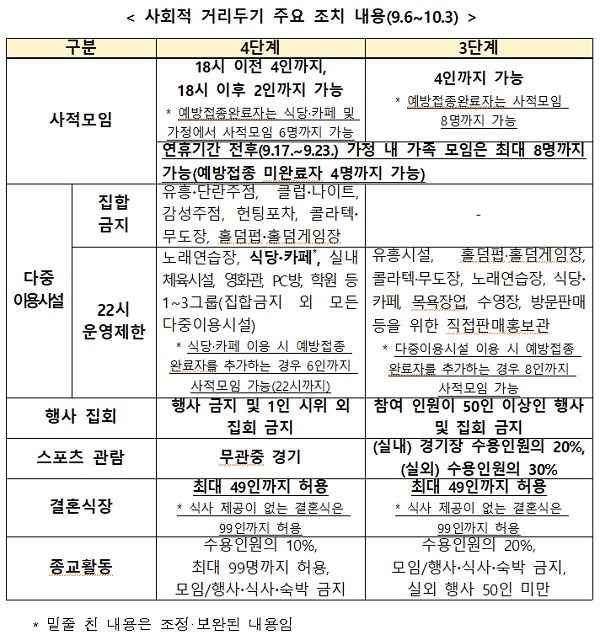 다만 4단계 지역 식당·카페의 매장 내 영업시간은 밤 9시에서 10시로 1시간 연장됐고, 3단계 지역 다중이용시설에서는 접종자 4명을 포함해 최대 8명까지 모일 수 있도록 방역수칙이 일부 완화됐다.