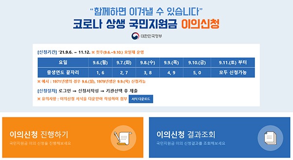 국민권익위원회가 오는 11월 12일까지 국민신문고 누리집(http://www.epeople.go.kr)에 코로나 상생 국민지원금 이의신청 창구를 운영한다.