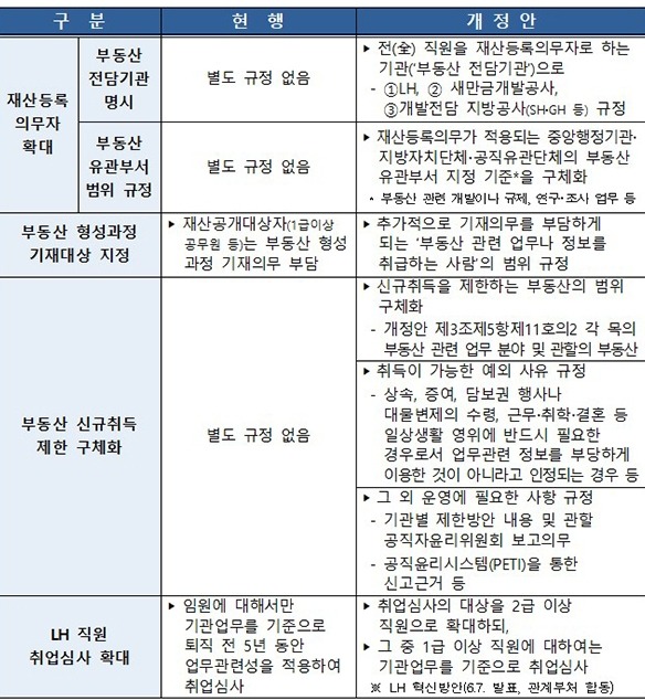 특히 한국토지주택공사(LH)와 새만금개발공사, 서울주택도시공사(SH), 경기주택도시공사(GH) 등 부동산 개발을 주된 기능으로 하는 지방공사의 모든 직원은 재산을 등록해야 한다.