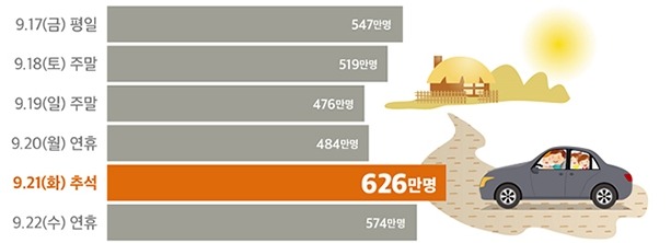 추석 당일인 21일에는 최대 626만명이 이동할 것으로 전망된다. 이는 작년 추석 당일보다 10.0% 증가한 수준이다. 하루 평균 고속도로 통행량은 472만대로 지난해 추석보다 7.7% 늘 것으로 교통연구원은 내다보고 있다.