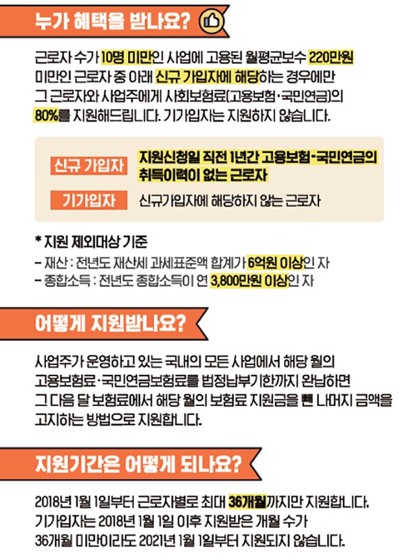 정부 지원금을 제외한 사회보험료의 사업주 부담금을 추가로 지원하고 있는데, 특히 두루누리 사회보험료 지원사업은 노동자 10명 미만 사업장의 월평균 보수 220만원 미만 노동자와 그 사업주의 고용보험료와 국민연금 보험료 80%를 지원한다.