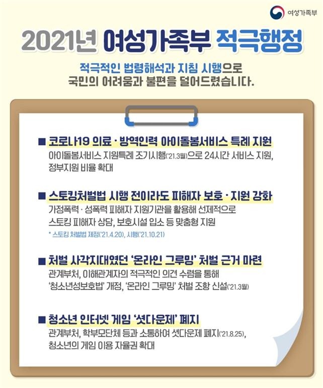 여성가족부가 코로나 19 의료‧방역인력에 대한 ‘긴급돌봄 지원’, 스토킹 피해자에 대한 ‘선제적 보호‧지원’ 등 현장 맞춤형 ‘적극행정’으로 국민들의 정책 체감도를 높이고 있다.
