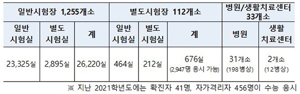 아울러 자가격리 중인 수험생이 응시할 수 있는 별도 시험장도 112곳 676실를 마련했으며, 확진 수험생이 응시할 수 있는 병원과 생활치료센터도 33곳 지정했다.
