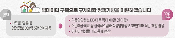 식약처는 식품영양정보를 수집해 통합 데이터베이스를 구축하고, 이를 어린이집·유치원·학교 급식시스템과 연계해 균형 잡힌 식단 개발 등에 활용한다.