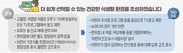 또 유튜브 광고에는 ‘자율 가이드라인’을 제공하고, 학교 주변 편의점에 건강한 식품을 판매하는 ‘어린이 건강코너’ 시범사업을 추진하며, 스마트어린이급식관리시스템을 도입해 급식을 표준화·통합관리한다.