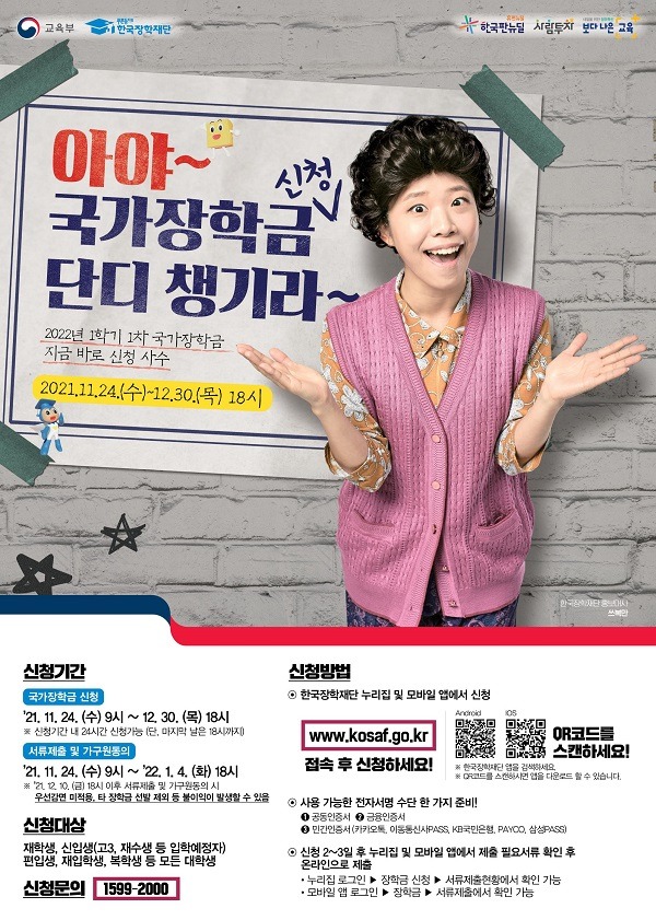 교육부와 한국장학재단은 이 같은 내용으로 개선된 2022학년도 1학기 1차 국가장학금 신청을 오는 24일 오전 9시부터 12월 30일 오후 6시까지 받는다고 밝혔다.