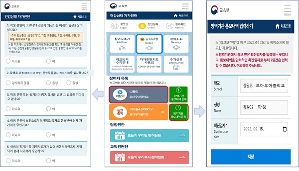 또 학생·교사가 방역기관으로부터 코로나19 확진자로 통보를 받을 경우 자가진단 앱에 ‘확진 일자’를 입력할 수 있도록 했다.