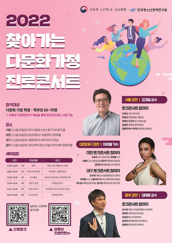 이번 진로콘서트는 서울·대전·대구·광주에서 4회 열린다. 강연자와 토크 콘서트 참석자가 다문화가정 학생·학부모들과 다양한 주제의 이야기를 나눌 예정이다.