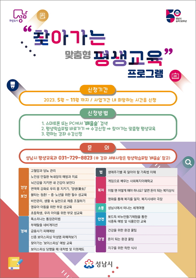 성남시는 오는 11 월 30 일까지 ‘ 찾아가는 맞춤형 평생교육 프로그램 ’ 을 운영한다 .