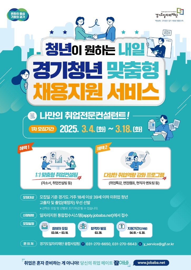 ‘경기청년 맞춤형 채용지원 서비스’는 취업 준비에 어려움을 겪는 청년 구직자를 위해 취업 전문 컨설턴트 매칭과 취업역량 강화 프로그램을 제공하는 사업이다.