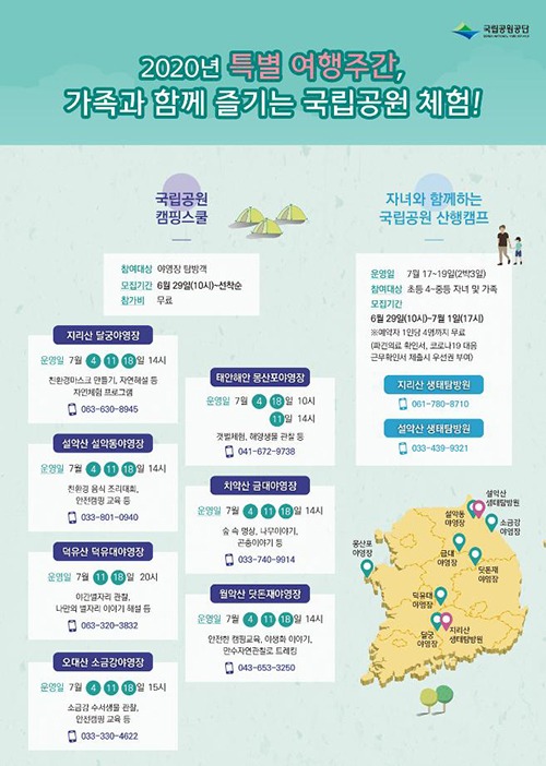 김종희 국립공원공단 탐방복지처장은 “2020년 특별 여행주간을 맞아 코로나19로 일상에 제약을 많이 받았던 어린이와 청소년들이 국립공원 자연 속에서 부모님과 함께 의미 있는 시간을 보내길 바란다”고 밝혔다.
