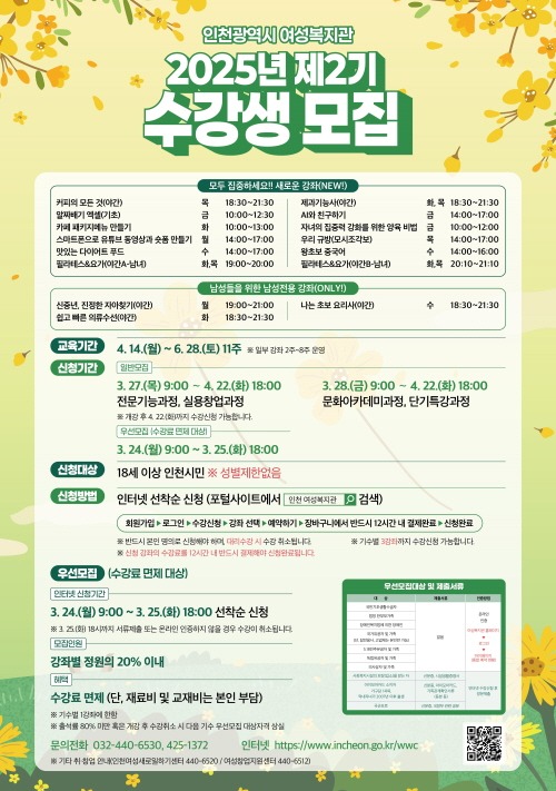 인천광역시 여성복지관이 오는 3월 24일부터 2025년도 제2기 사회교육강좌 수강생을 모집한다고 밝혔다.