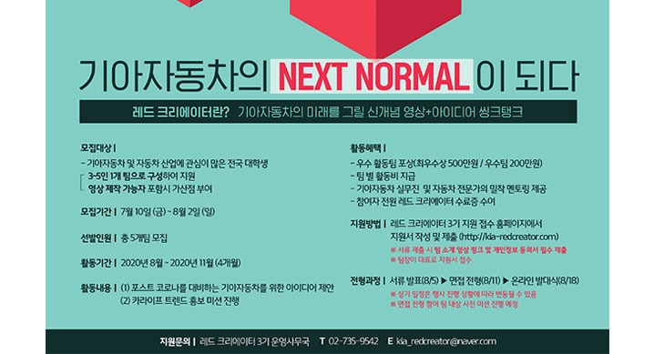 기아자동차㈜가 포스트 코로나 시대, 기아자동차의 미래를 함께 고민할 대학생 서포터즈 ‘레드 크리에이터’ 3기를 모집한다.