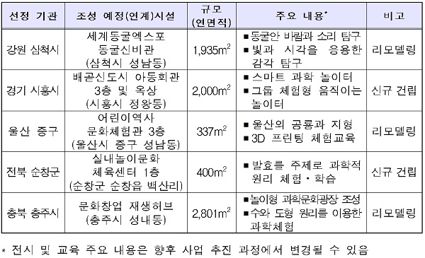 강원 삼척시, 경기 시흥시, 울산 중구, 전북 순창군, 충북 충주시 등 기초지자체 5곳에 어린이 과학체험공간이 생긴다.
